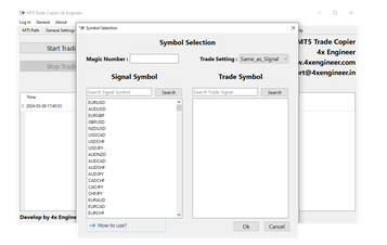 "MT5 Trade Copier" offers a flexible approach to symbol management, enabling users to select symbols for both signal (master) and trade (slave) MetaTrader-5 accounts. Users can search and select different symbols for the master and slave accounts, offering the flexibility to trade across various currency pairs or instruments. The software supports settings such as 'Same as Signal', 'Opposite', and the option to choose entirely different symbols for the signal and trade accounts. This is particularly useful for users who wish to apply different trading strategies across various instruments or who need to manage multiple trading scenarios simultaneously. Additionally, the use of magic numbers allows for precise identification and management of trades, providing users with a robust system for tracking and organizing their trading activities