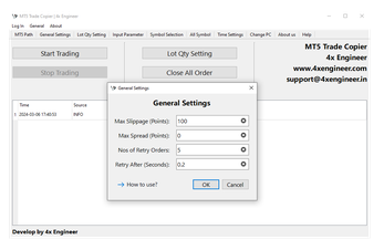 "MT5 Trade Copier" is an innovative software designed to seamlessly replicate orders between two MetaTrader-5 (MT5) accounts. It allows traders to copy trades from a 'Master MT5' account to a 'Slave MT5' account instantly, ensuring synchronization in trading activities. The software features customizable settings including maximum slippage and spread, retry orders, and time configurations. It supports various lot settings such as fixed, auto, or replicating the master's lot size. Advanced options include input parameters like maximum trades, daily profit, and loss limits, alongside flexible symbol selection with 'same as signal' or 'opposite' trade settings. Time settings allow traders to define operational periods, enhancing trade control and efficiency.